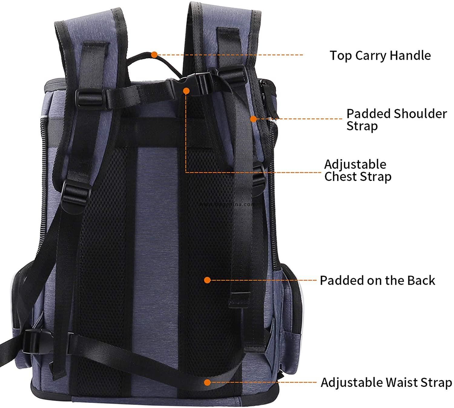 The widened mesh shoulder straps are adjustable and comfortable for breathability. Ergonomic design and adjustable chest strap and adjustable waist strap design can help reduce load and increase comfort, so that the shoulders are evenly stressed and reduce back pressure. In order to use the pet backpack more comfortably, it is recommended to adjust the shoulder/chest/waist strap to the most comfortable state before use.