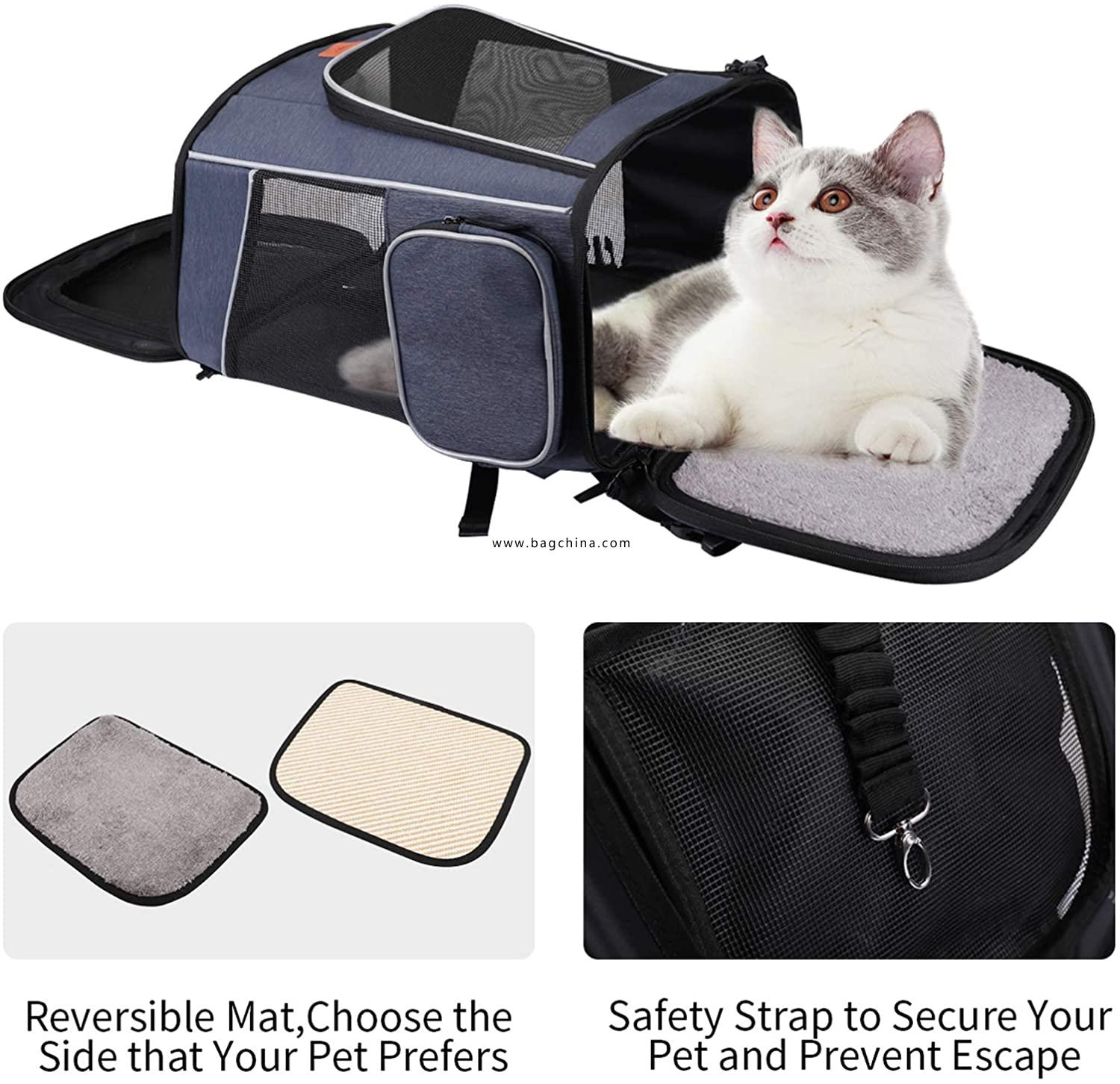 Pockets on both sides of the pet bag provides more room for storage. this pet travel backpack is equipped with a blue foldable dog bowl.