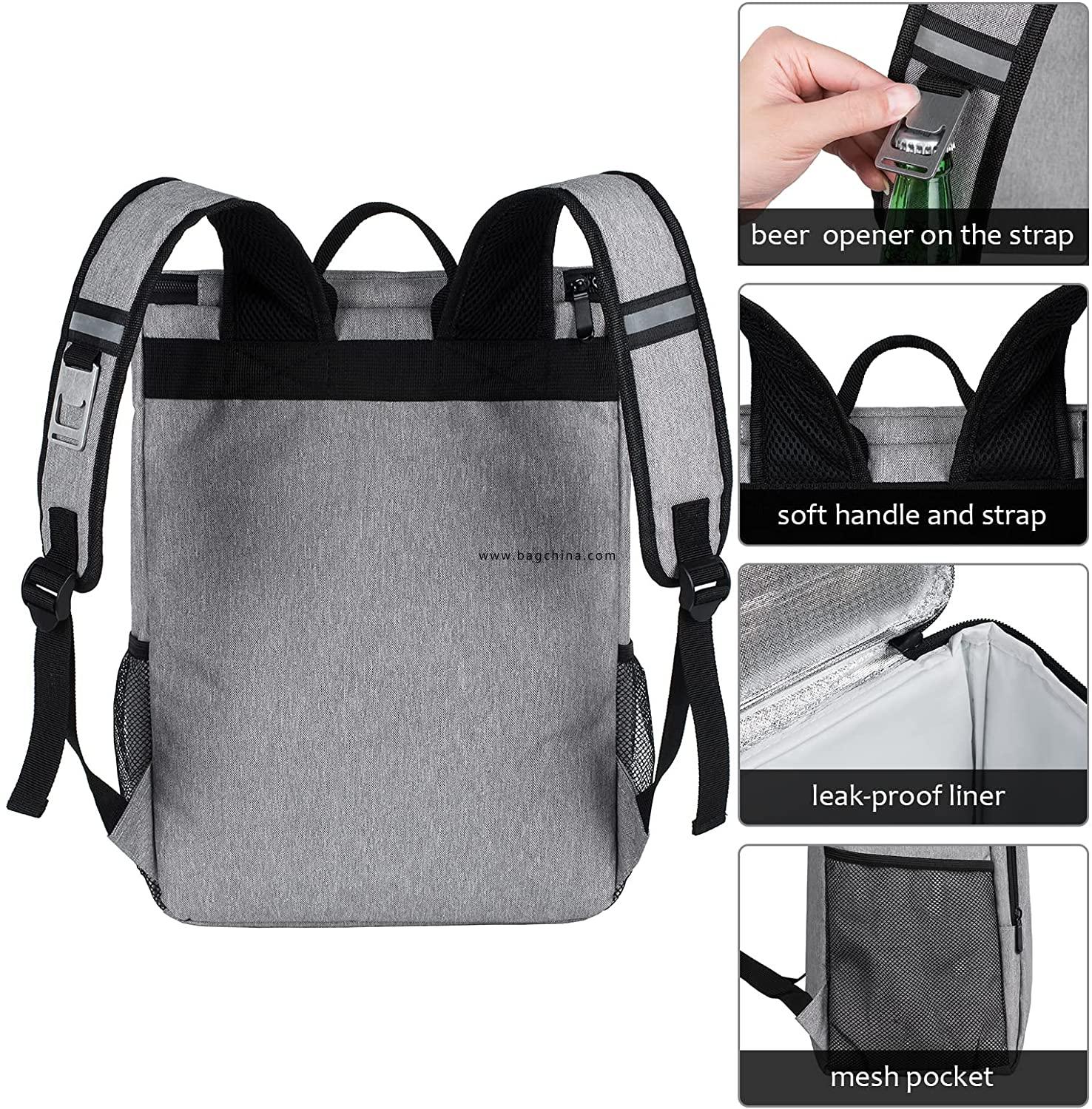 This backpack comes with 1 main spacious storage compartment, 2 side mesh pockets for storing items such as wine, canned crisps, umbrellas, 1 large front zipper pocket for dry items such as cutlery, 1 outermost portable vertical pocket for storing small items such as cell phones, keys, ID cards etc. The backpack has an extra beer bottle opener on the shoulder strap.