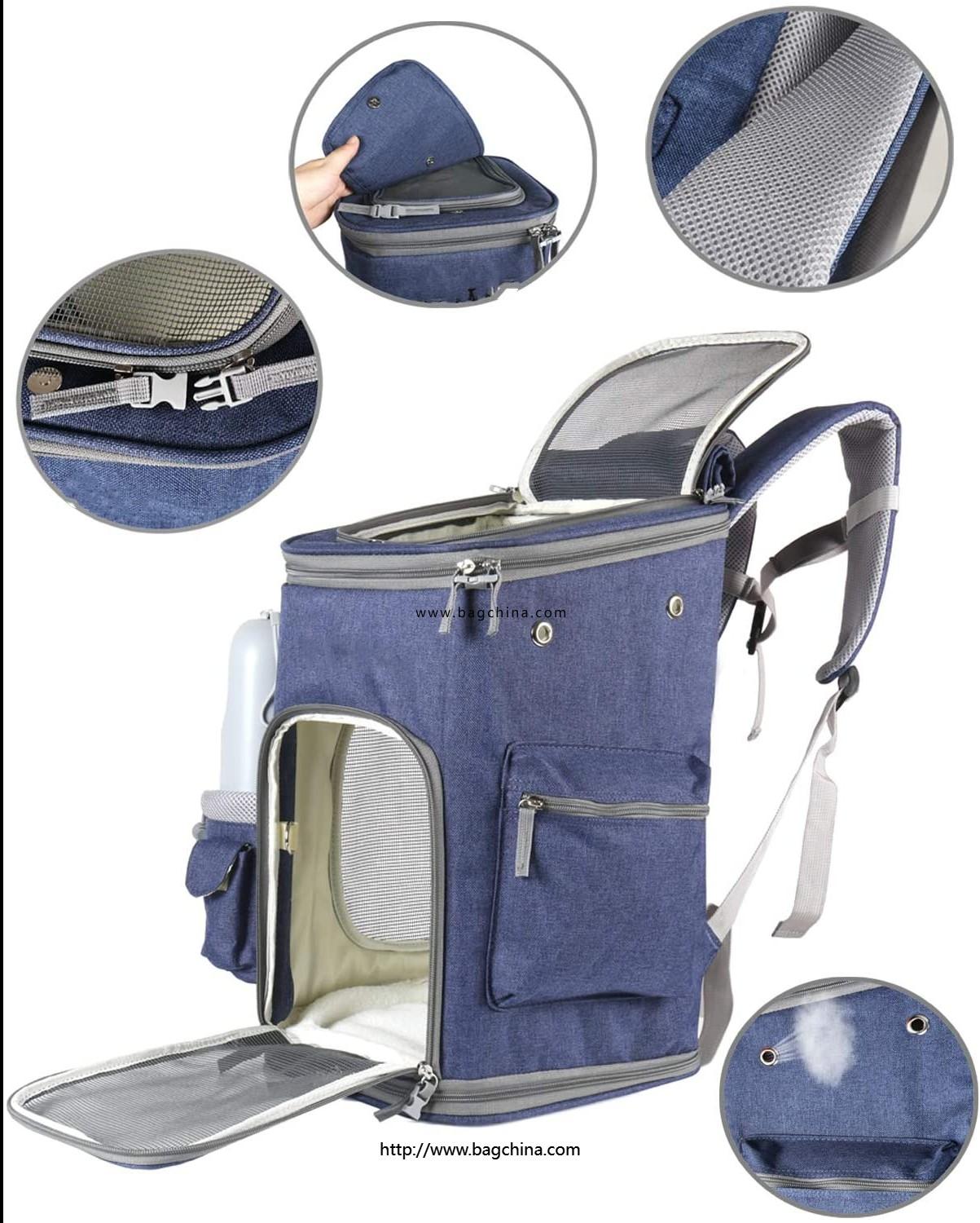 The pet carrier has two entrances which make it possible for your pet to stick his head out. You can feed your dog or play with him without putting the carrier bag down. The top pad could be rolled up for convenience. And the four breathable mesh windows are designed for visibility and air ventilation