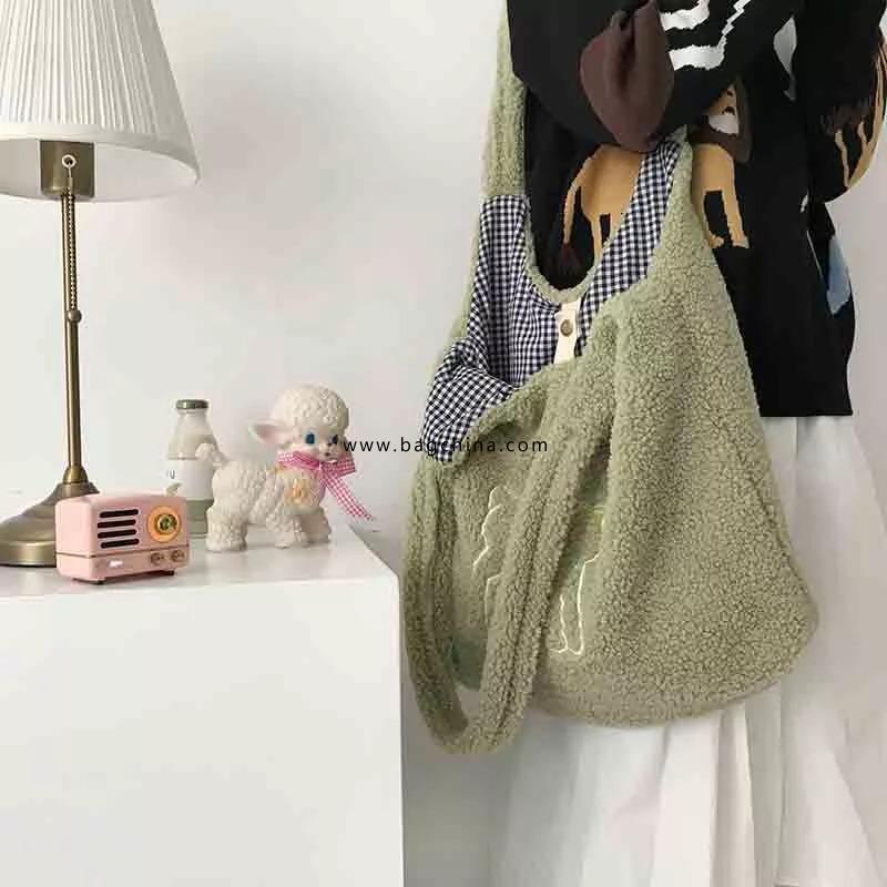 Women Lamb Like Fabric Shoulder Bag Simple Canvas Handbag Tote Large Capacity Embroidery Shopping Bag Cute Book Bags for Girls