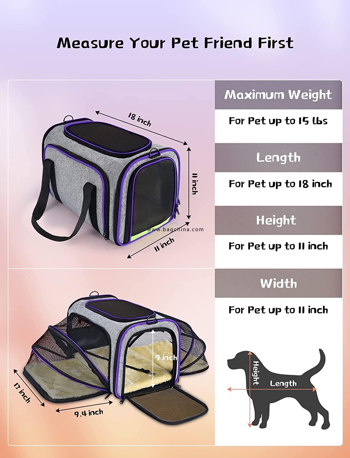Larger Space, Less Weight! - The extra space on the sides of the expandable soft-side cat carrier bag comes very handily while your lovely pet friends can stretch out entirely during long flights. The pet carrier airline approved is 18"Lx 11"Wx 11"H with expandable size 18" Lx 29.8"W x 11"H.